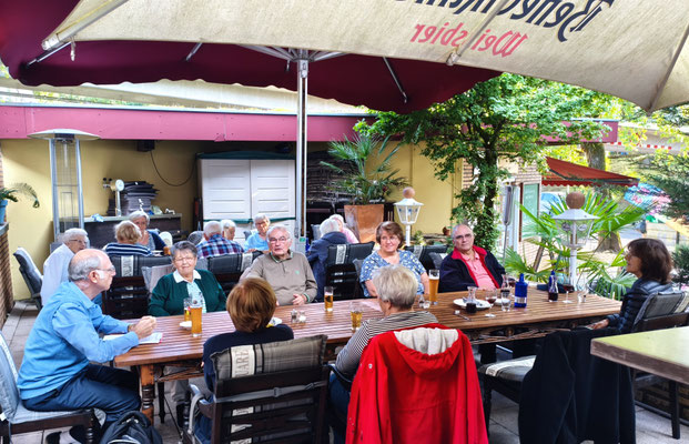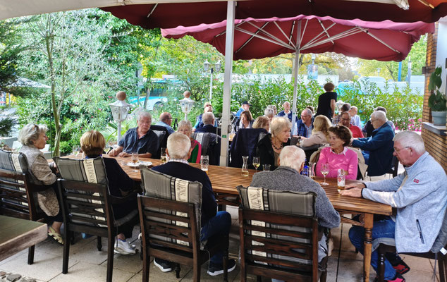 50 Personen saßen bei sommerlichem Wetter auf der Restaurantterrasse und ließen es sich schmecken und hatten ihren Spaß.